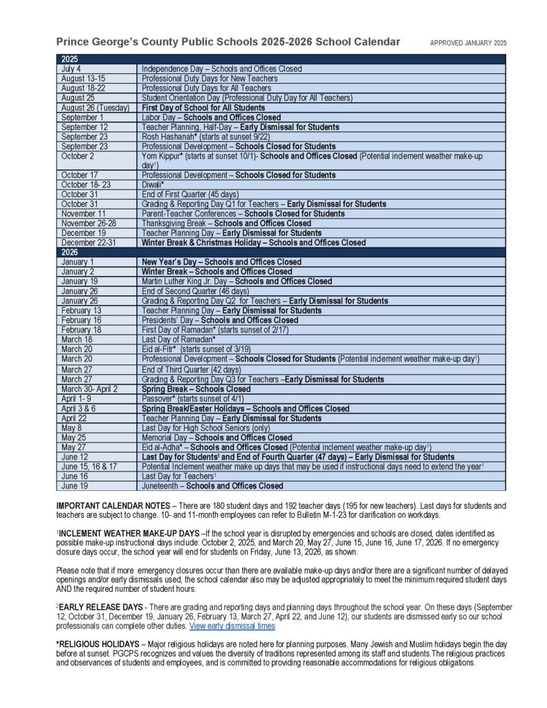 Please visit the Prince George’s County school calendar by clicking here: